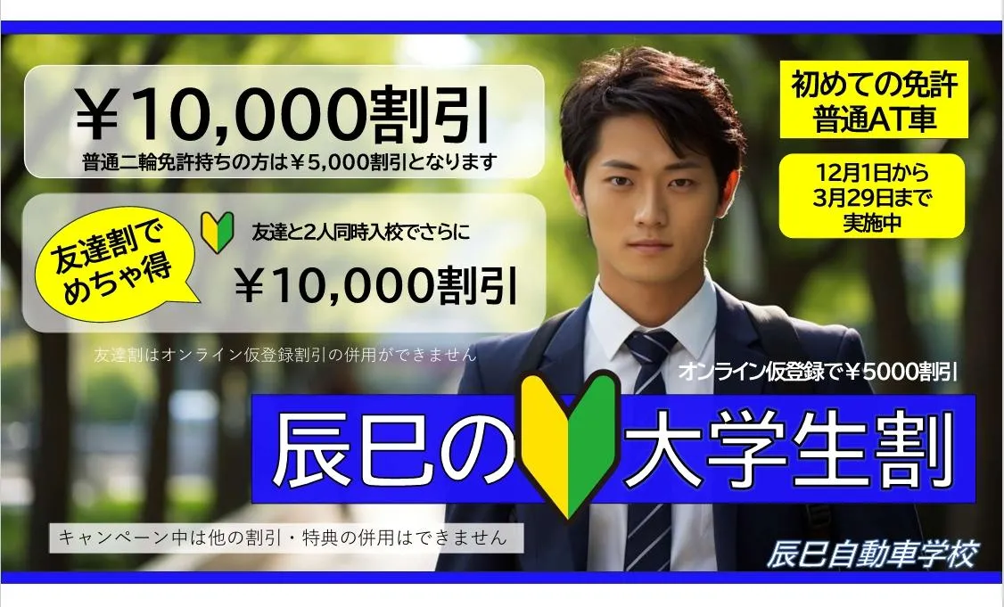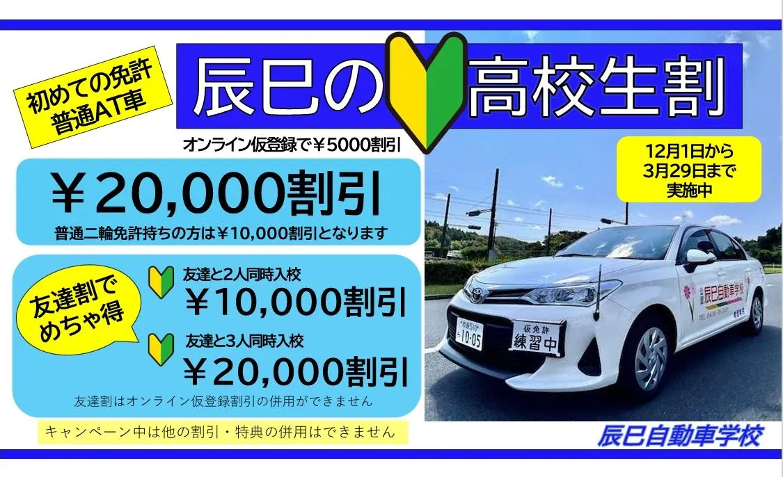 教習料金から(四輪は¥5,000・二輪は¥3,000割引をさせていただきます。